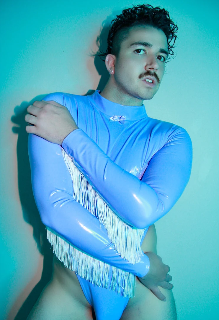 WHAT IT IS: Giving you all your faux latex fantasies in a shiny PU coating on white poly spandex 90% Poly, 10% Spandex, PU Coating.