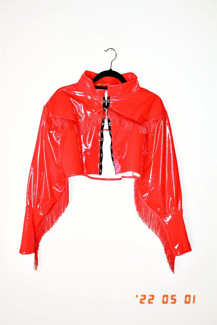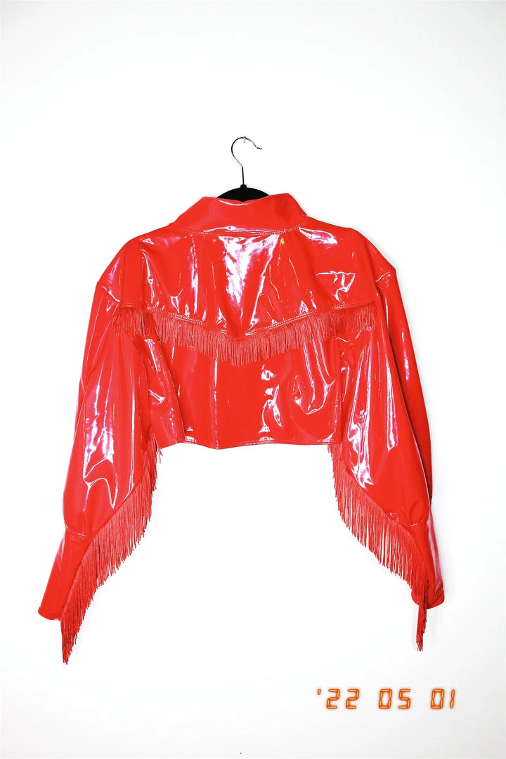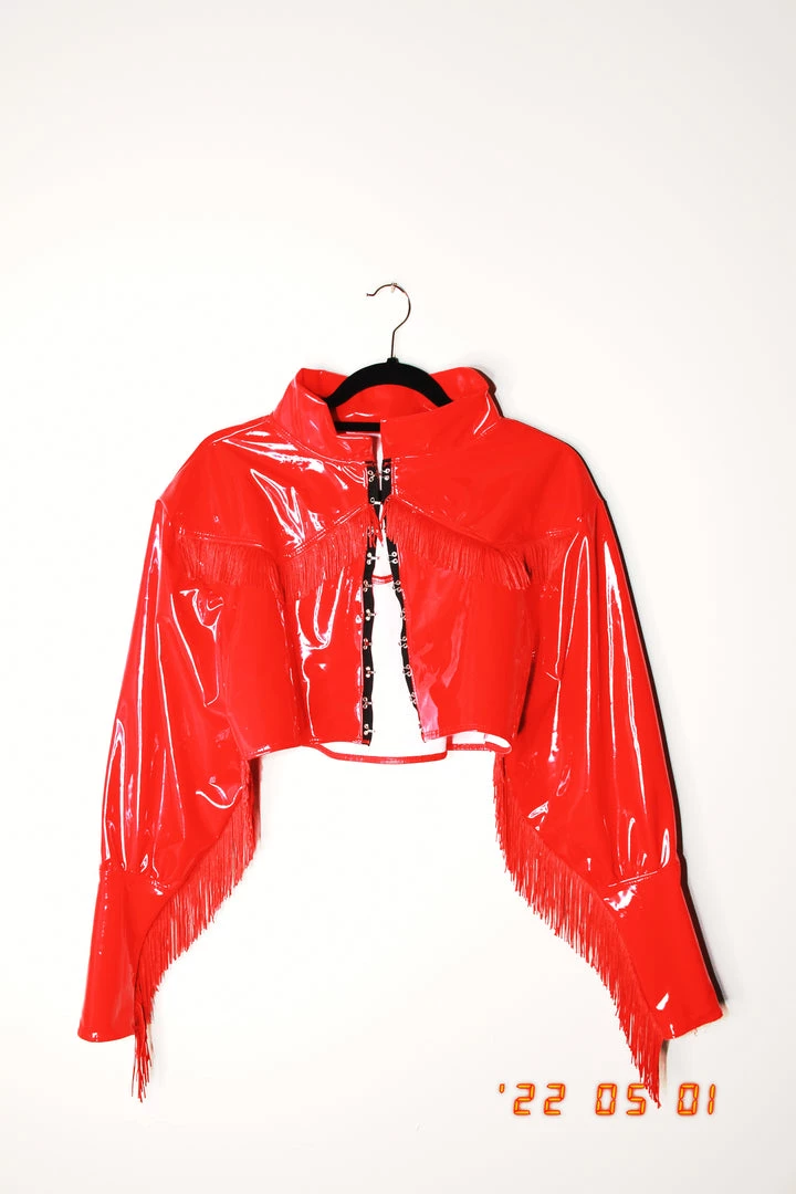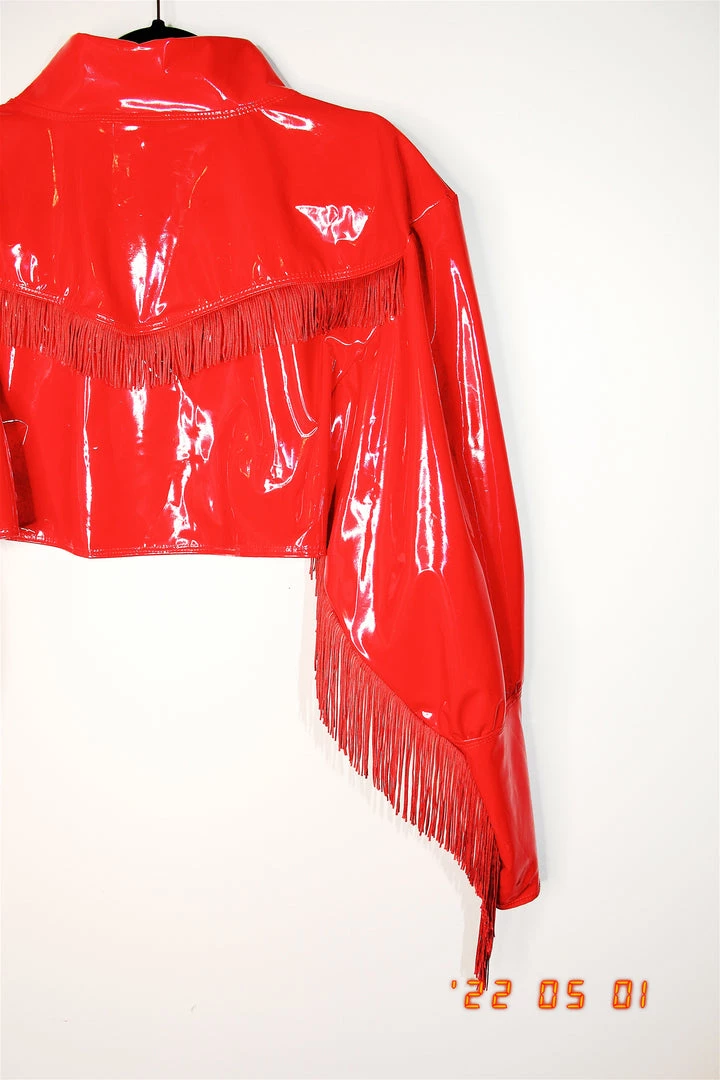WHAT IT IS: Red shiny PU coating on white poly spandex 90% Poly, 10% Spandex, PU Coating.